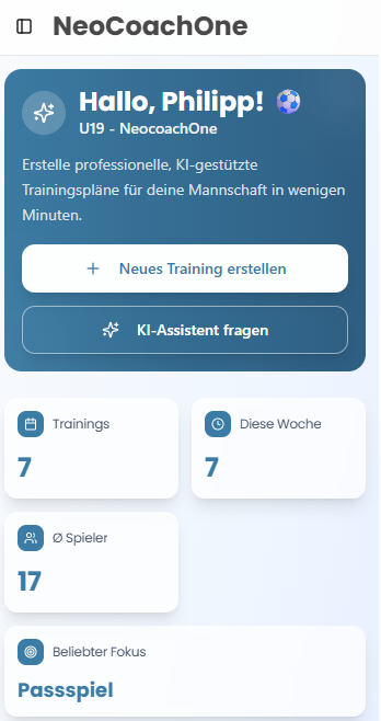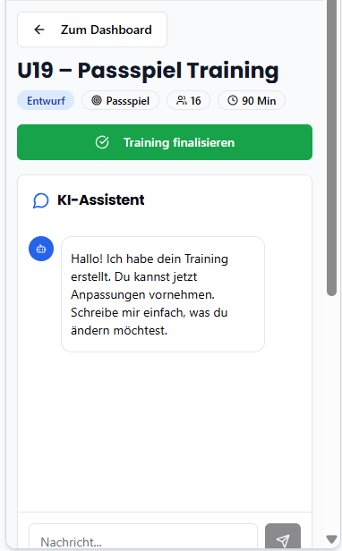 Mit unserer KI-gestützten Lösung hebst du deine Trainingsplanung auf ein neues Level – schnell, individuell und mühelos. Anstatt jede Einheit selbst auszuarbeiten, unterstützt dich unser smarter Chatbot dabei, passgenaue Trainingspläne zu erstellen, die exakt auf die Bedürfnisse deiner Mannschaft abgestimmt sind.